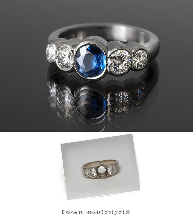 ![]() Vanhojen sormusten timantit ja kulta on käytetty hyväksi uudessa sormuksessa. | ![]() Asiakkaan vanhaan titaanisormukseen on lisätty timantteja. | ![]() Asiakkaan timanttisormuksen molemmille puolille on tehty siihen sopivat timanttisormukset. |