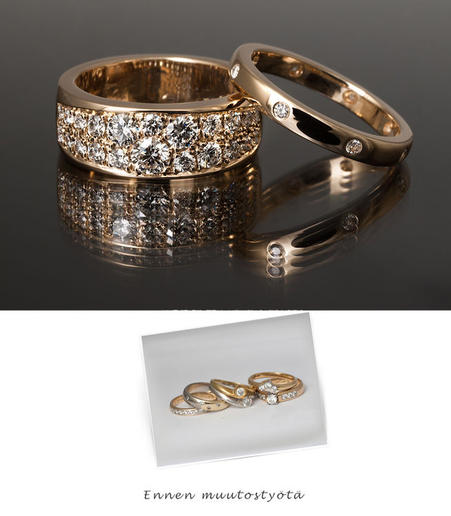 ![]() | ![]() Asiakkaan vanhojen sormusten kivet on käytetty hyväksi uuteen titaanisormukseen. Vanhojen sormusten kulta on käytetty maksuvälineenä. | ![]() Vanhojen sormusten timantit on käytetty hyväksi uusissa titaanisormuksissa ja kulta on käytetty hyväksi maksuvälineenä. |